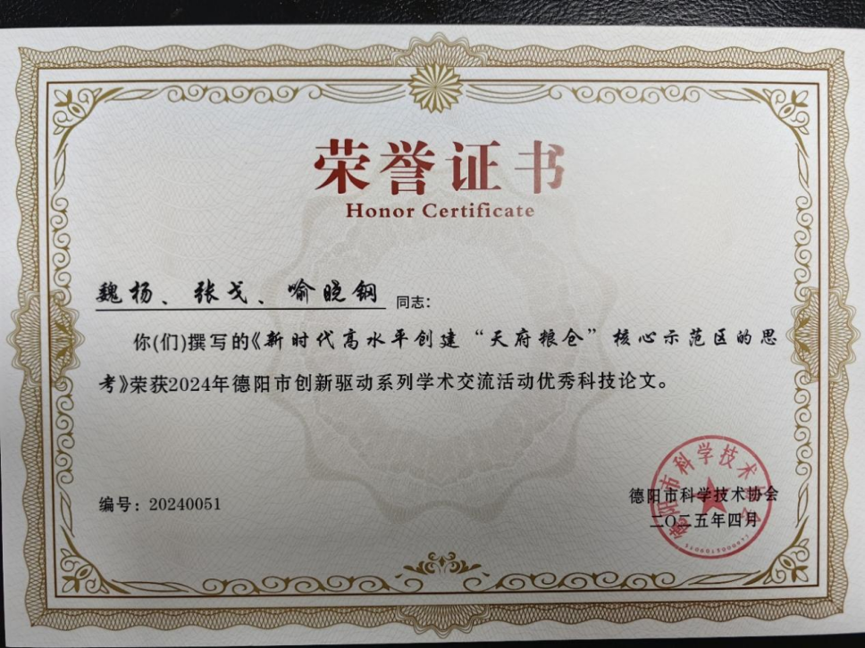 喻晓钢与四川工程职业技术大学魏杨教授等专家学者合作撰写了《新时代高水平创建“天府粮仓”核心示范区的思考》,结合“天府粮仓”建设,针对德阳创建“天府粮仓”核心示范区三大优势,提出了在德阳创建“天府粮仓”核心示范区的三大原则和三条实现路径的前提下,通过四大试点任务的实施,着力助推德阳高水平“天府粮仓”。
