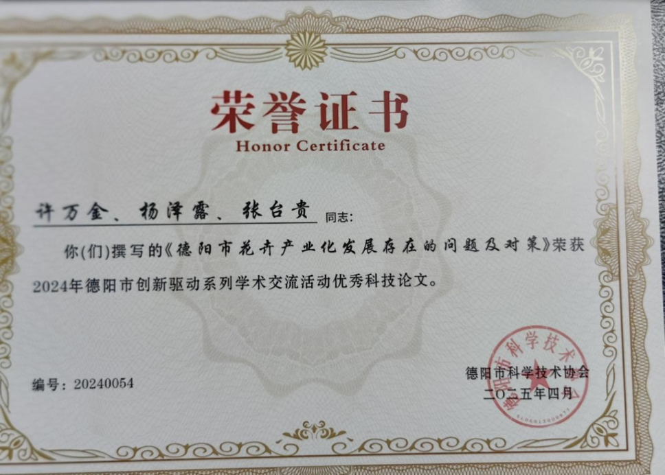 德阳市老科协农工委会员胡坚、谢天佑、姜显琪、左谦、喻晓钢、郑强、郑雄、许万金、杨泽露、王家国、张台贵等,积极参与德阳市2024年创新驱动系列学术交流活动,踊跃提交学术论文,先后提交涉及农业、林业、生态多样性研究、环境保护等内容的学术论文30余篇,其中:《毛泽东与邓演达的“三农”思想研究》《新时代高水平创建“天府粮仓”核心示范区的思考》《德阳市大熊猫及其栖息地保护存在的问题及对策》《德阳市花卉产业化发展存在的问题及对策》《德阳市国家储备林建设存在的问题及对策》《德阳市蔬菜产业发展存在的问题及对策》《德阳市农村外来入侵物种防控存在的问题及对策》《绵竹市山地旅游开发存在的问题及对策》等获2024年德阳市创新驱动系列学术交流活动优秀科技论文奖,上述获奖论文还在德阳市2024年创新驱动系列学术交流活动“乡村振兴与农业产业发展”分会场进行了专题学术交流,并被收录入中国科学技术出版社出版的《2024年德阳市创新驱动系列学术交流文集》。