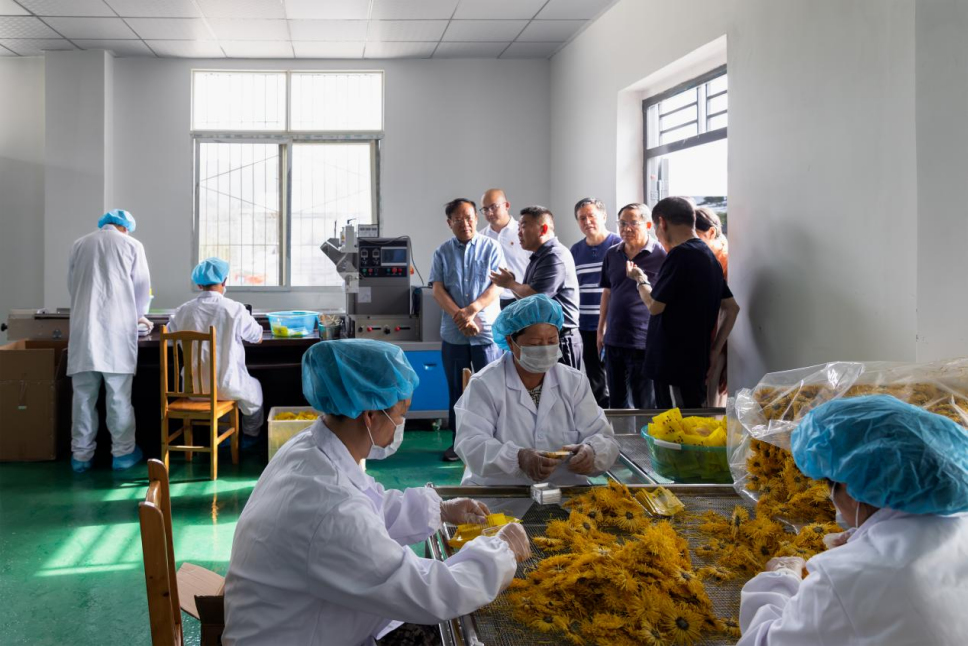 在凯江大回湾,调研组一行先后到凯江大回湾观景平台和菊花加工车间进行现场调研。旌阳区双东镇镇长龚韬汇报了双东镇经济社会、推进凯江大回湾农文旅融合发展等情况,金锣桥村党支部书记左希柏汇报了该村农业产业发展、金锣鸣菊产业园产业园区建设、德阳市老科协老专家营地推进凯江大回湾农文旅融合发展所做的工作等情况;观看了“旌秋凯江,鸣菊绽放”等金锣鸣菊产业园建设带动农文旅融合发展的视频,了解了有关情况。