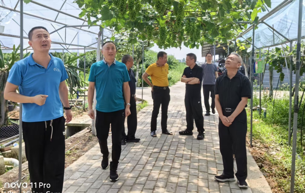 随后,调研组走进绵竹市“老专家科技服务营地”——什地镇万圣农庄。现场管理人员一边引导参观,一边详细介绍:农场秉持绿色发展理念,采用生物防治和有机耕作方式,目前已种植60余亩葡萄,同时还种植了柑橘、火龙果、桃子、甘蔗等水果,种植总面积达100余亩。绵竹市老科协针对农庄发展多渠道开展服务:一是挂牌老专家科技服务营地,亮明专家身份、电话号码;二是老专家多次到农庄问需;三是联系农业等有关部门给予政策支持与鼓励;四是开展现场培训,示范带动周边农民参加种植。通过老专家们的技术指导与资源对接,农场在发展过程中不断攻克技术难题,逐步实现规模化、特色化经营。
