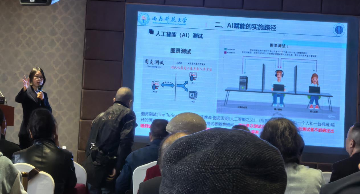 徐老师以通俗易懂的语言,以《携手人工智能 共创美好未来》为主题,从“今天,你与AI互动了吗”讲起,阐述“做人工智能时代的适应者——拥抱变化”的重要性。讲座按AI赋能的必然趋势、AI赋能的实施路径、2024 AI元年和2025 AI Agent元年、总结与风险防范等五个部分,深入浅出地阐述了人工智能的定义、发展历程以及在不同领域的应用和发展。在讲解人工智能的发展历程时,徐老师通过2025年初热门影片《哪吒》、《长安三万里》、海量动物数据等图片、音像、文字,带领大家穿越时空,见证人工智能从最初的设想逐步走向现实的艰辛与辉煌。从图灵提出“图灵测试”为人工智能奠定理论基础,到如今深度学习算法的突破,推动人工智能在图像识别、语音识别等领域取得巨大成功,每一个里程碑式的进展都让大家惊叹不已。