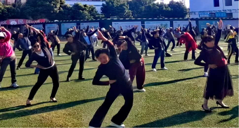 随着第五套广播体操的节奏,全体运动员踏着整齐的脚步展开队形。在雄壮的乐曲声中,运动员们抬头挺胸,用力甩着胳膊,有节奏地完成了全套体操动作。