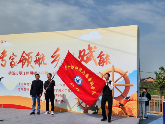 德阳市老科协党委书记、会长李思清为“德阳罗江老科协科技志愿者服务队”授旗。
